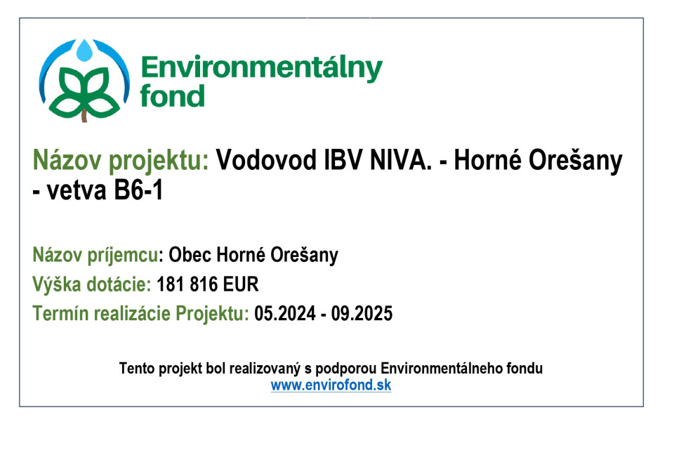 Obec Horné Orešany uzavrela dňa 5. 12. 2024 Zmluvu o poskytnutí podpory z Environmentálneho fondu formou dotácie č. 232692 08U01 na projekt ,,Vodovod IBV NIVA. - Horné Orešany - vetva B6-1“.