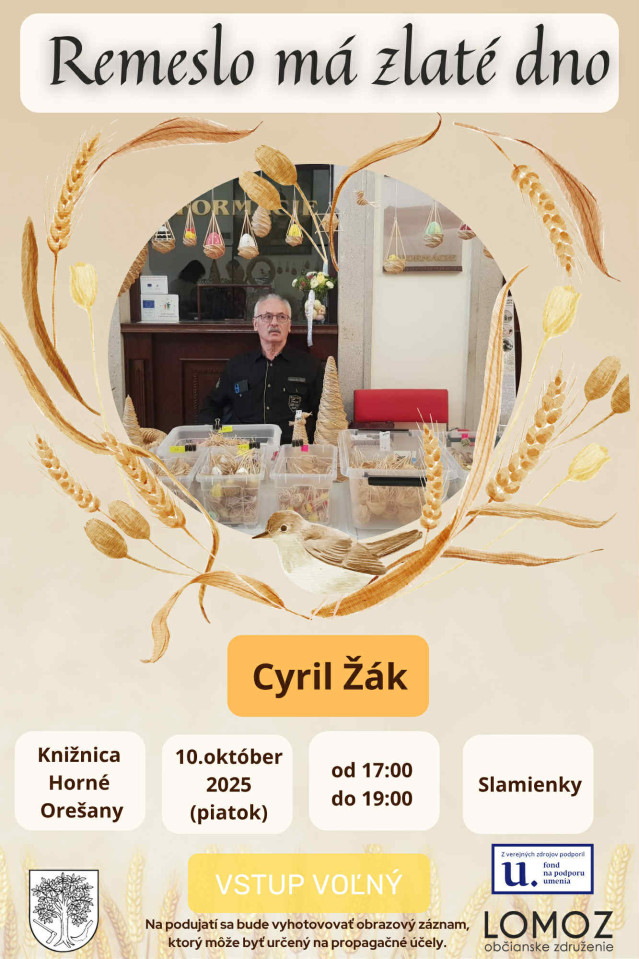 Ako posledný remeselník navštívi naše priestory pán Cyril Žák so svojím remeslom - Slamienky. Beseda s remeselníkom bude doplnená o jeho praktické ukážky, tvorivé dielne a knižnú burzu. Vstup je voľný. Tešíme sa na vašu účasť.