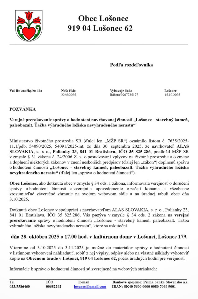 Dotknutá obec Lošonec v spolupráci s navrhovateľom ALAS SLOVAKIA, s. r. o., Polianky 23, 841 01 Bratislava, IČO 35 825 286, pozýva verejnosť v zmysle § 34 ods. 2 zákona NR SR č. 24/2006 Z.z. o posudzovaní vplyvov na životné prostredie a o zmene a doplnení niektorých zákonov v znení neskorších predpisov na verejné prerokovanie správy o hodnotení činnosti „Lošonec - stavebný kameň, paleobazalt. Ťažba výhradného ložiska nevyhradeného nerastu“, ktoré sa uskutoční