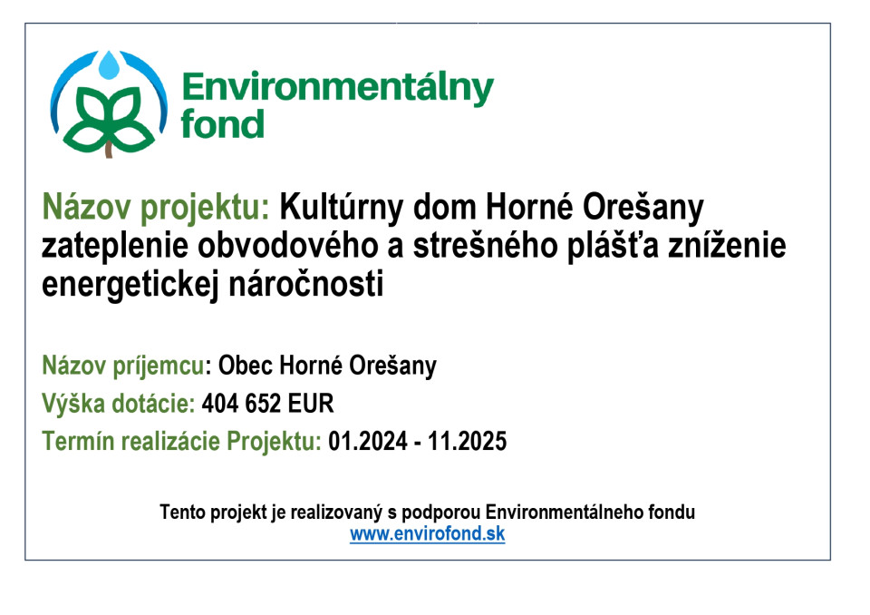 Obec Horné Orešany uzavrela dňa 26. 11. 2024 Zmluvu o poskytnutí podpory z Environmentálneho fondu formou dotácie č. 233238 08U02 na projekt ,,Kultúrny dom Horné Orešany zateplenie obvodového a strešného plášťa zníženie energetickej náročnosti“.