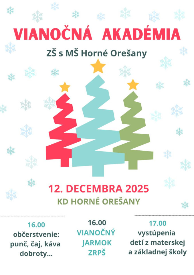 V piatok 12. decembra 2025 sa v kultúrnom dome uskutoční Vianočná akadémia žiakov ZŠ s MŠ Horné Orešany. Okrem krásnych vystúpení našich detí z materskej a základnej školy so začiatkom o 17.00 hod. sa aj tento rok môžete tešiť na vianočný jarmok ZRPŠ s pestrým sortimentom, ktorý sa začne už o 16.00 hod.