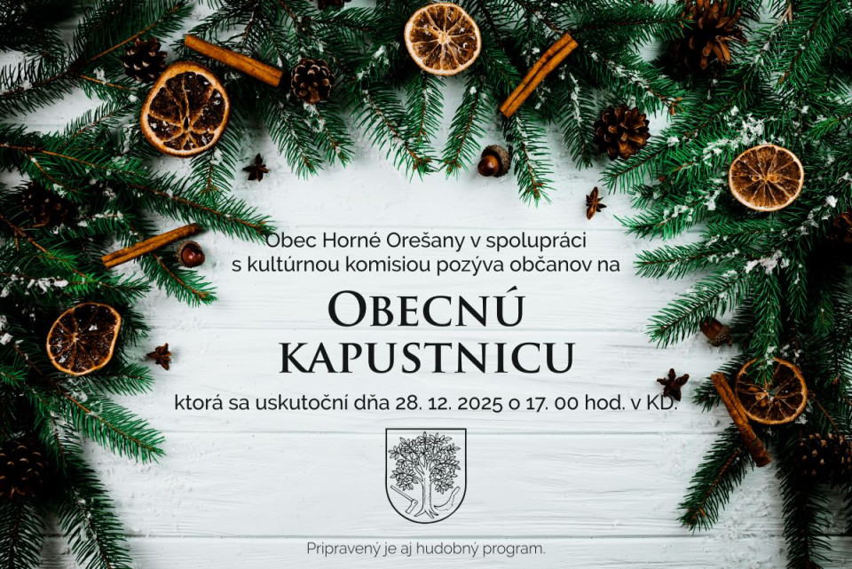 Obec Horné Orešany v spolupráci s komisiou kultúry, športu a vzdelávania pozýva občanov na podujatie Obecná kapustnica, ktorá sa uskutoční v nedeľu 28. 12. 2025 o 17. 00 hod. v kultúrnom dome.