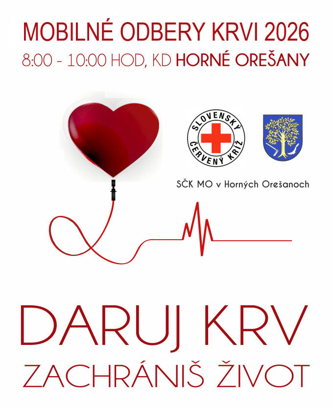 Slovenský červený kríž, miestna organizácia v Horných Orešanoch, pozýva na mobilné odbery krvi, ktoré sa uskutočnia v kultúnom dome v termínoch:
