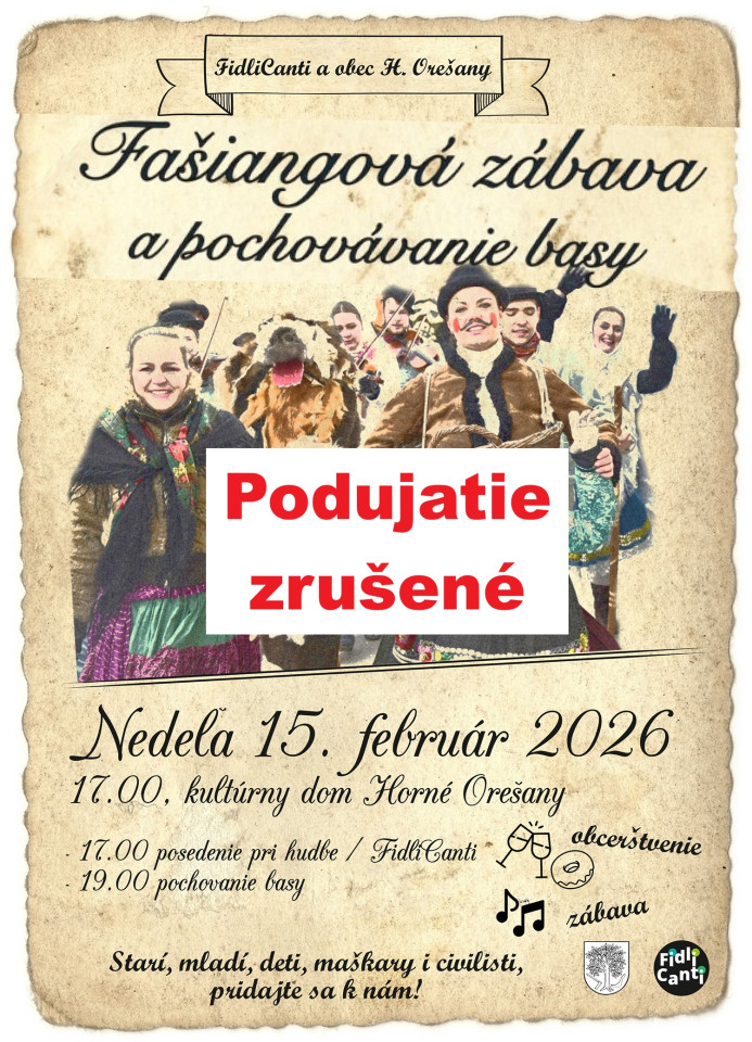 ZRUŠENÉ OZ FidliCanti a obec Horné Orešany Vás i tento rok srdečne pozývajú na veselú rozlúčku s fašiangami. V nedeľu 15. februára bude náš kultúrny dom opäť patriť zábave, hudbe a fašiangovým dobrotám. Začíname o 17. hodine, kedy Vás svojím vystúpením zabaví Cimbalová ľudová hudba FidliCanti. Po kultúrnom programe bude o 19. hodine už tradične nasledovať pochovávanie basy, ktorým symbolicky vstúpime do pôstneho obdobia.