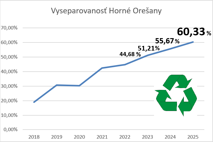 Obec Horné Orešany v zmysle §3 a §4 Zákona č. 329/2018 Z.z. o poplatkoch za uloženie odpadov a o zmene a doplnení zákona č. 587/2004 Z.z. o Enviromentálnom fonde a o zmene a doplnení niektorých zákonov v znení neskorších predpisov oznamuje, že úroveň vytriedenia komunálnych odpadov za rok 2025 je 59,66 %