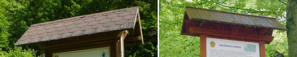 Časť informačných tabúľ má ochrannú striešku pokrytú asfaltovým/kanadským šindľom (z roku 2002) a na časti je strieška z dreveného impregnovaného šindľa (z roku 2007, obr. 3a). Striešky s dreveným šindľom boli očistené, drôtenou kefou bol odstránený nárast machu, lišajníkov a boli natreté lazúrou Chemolux. Oprava striešky s kanadským šindľom bola urobená dodávateľsky pri VN Parina.